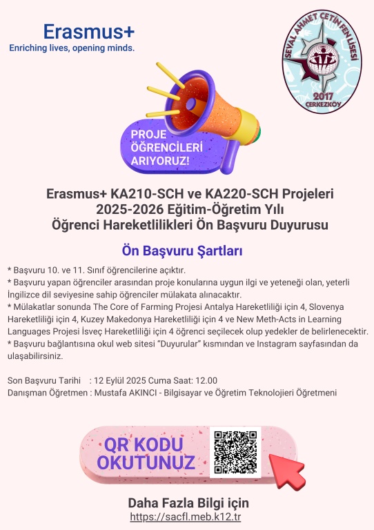 Erasmus+ KA210-SCH ve KA220-SCH Projeleri 2025-2026 Eğitim-Öğretim Yılı Öğrenci Hareketlilikleri Ön Başvuru duyurusu için aşağıdaki bağlantıya tıklayınız.