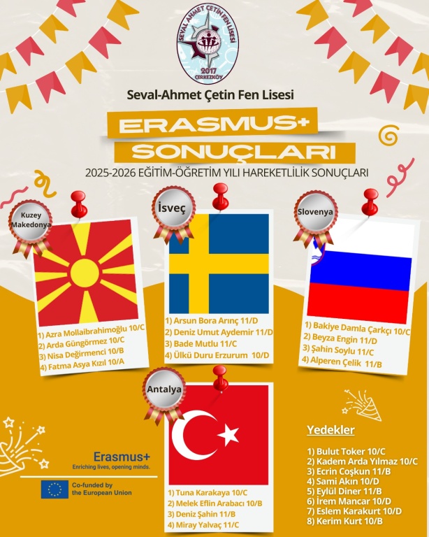 10. ve 11. Sınıf öğrencilerinden toplamda 74 öğrencinin başvuru yaptığı 2025-2026 eğitim-öğretim yılı New-Meth Acts in Learning Languages Projesi İsveç Hareketliliği için 4 öğrenci ve The Core of Farming and Traditional Country Hospitality Projesi Antalya Hareketliliği için 4 öğrenci, Kuzey Makedonya Hareketliliği için 4 öğrenci ve Slovenya Hareketliliği için 4 öğrenci asil, toplamda 8 öğrenci de yedek olarak Erasmus+ Proje Ekibi öğretmenleri tarafından belirlenmiştir. Seçilen öğrencilerimizi tebrik ediyor, başarılarının devamını diliyoruz.